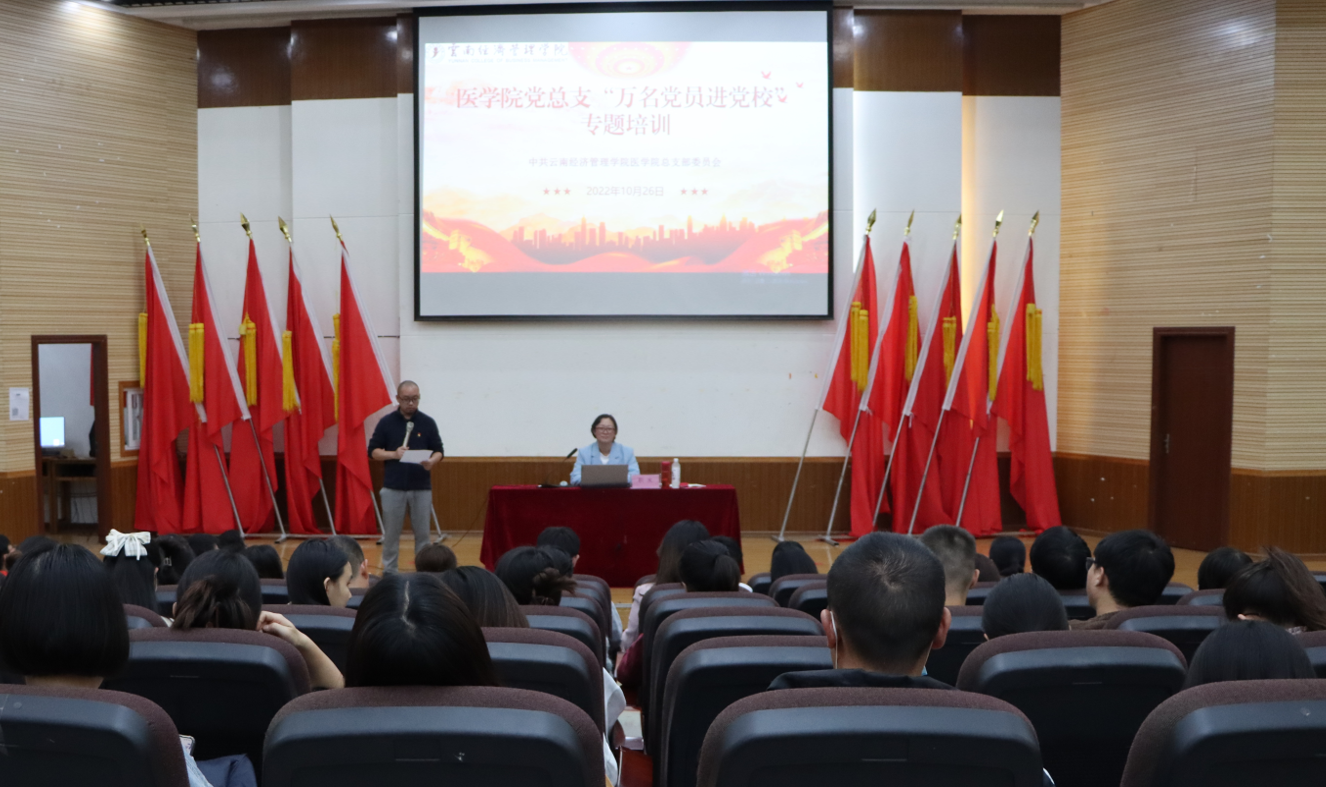 - 为了深入学习贯彻党的二十大精神,聚焦全面贯彻党的教育方针,落实全面从严治党方面和立德树人的根本任务,持续巩固党史学习教育的成果。医学院党总支于2022年10月26日在实训楼201开展了“万名党员进党校”专题培训会。此次参会人员有医学院全体党员、预备党员、党员活动中心全体人员。