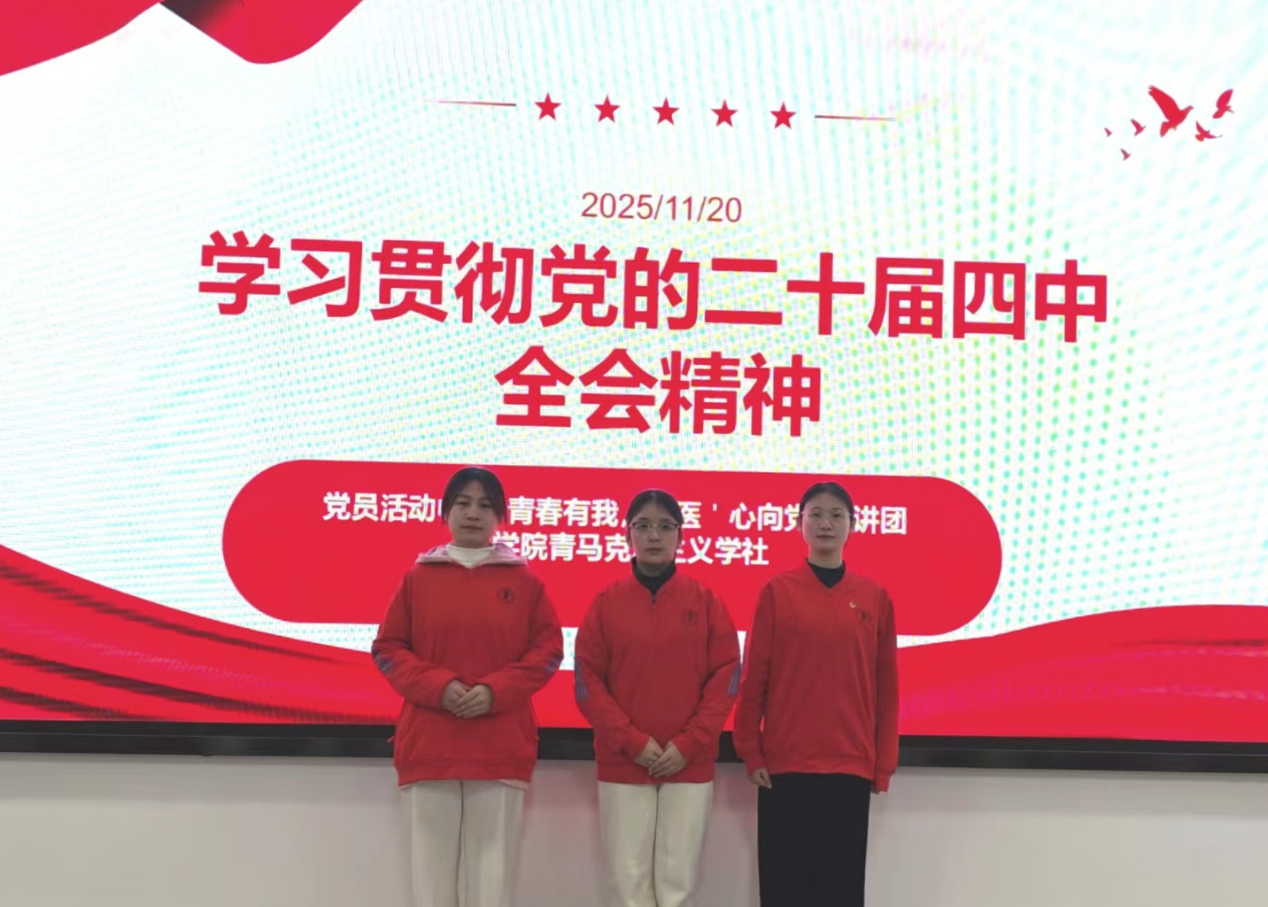 - 2025年11月,云南经济管理学院医学院通过青年宣讲、教室解读等形式,持续推动党的二十届四中全会精神在青年医学生中落地生根,让全会精神与医学专业实践深度融合,为青年成长锚定方向。 第一篇章青年宣讲:从“核心任务”到“实践落地” 11月20日,医学院党员活动中心“青春有我,‘医’心向党”宣讲团联合青年马克思主义学社,在附二楼302教室展开宣讲。宣讲团成员蔡树彭、李叶、许筱雯分别从核心任务、根本保障、战略方向三大维度,为200余名同学解读全会精神。 蔡树彭聚焦农业农村现代化、文化繁荣、绿色转型三大核