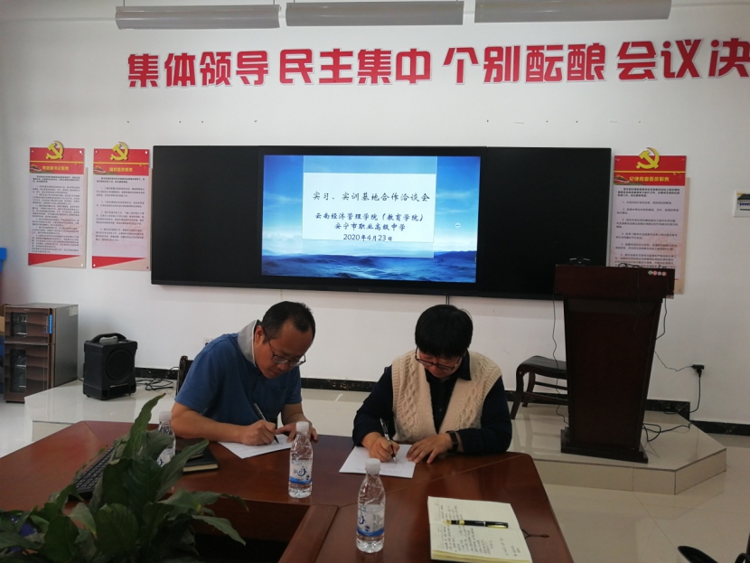 2020年4月23日上午9:30分,云南经济管理学院教育学院与安宁市职业高级中学实习实训基地签约仪式在安宁市职业高级中学会议室顺利举行。教育学院院长崔立华教授,体育教育系主任张娟,操类教研室主任郑嵘婷参加仪式。仪式由安宁市职业高级中学副校长潘立主持,校长猫良洪,副校长蔡春华,体育组组长蔡汝华参加签约仪式。首先,由安宁市职业高级中学猫良洪校长对安宁职业高级中学的总体情况进行介绍,对学生的实习实训提出总体要求,并表示,能够通过两校的精诚合作,共同培养社会有用的人才。
