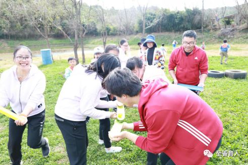 午饭后由战狼拓展基地的教练对全体教师进行随机分组,根据人数分为12个小组,每组11位老师。拓展活动由四个项目组成,第一个项目进行的是”我们是一家人”的集体口手协调的破冰活动,以此来促进了教师之间的相互认识和了解。12组教师积极、热情投入活动,项目结束后第一组以6秒49的成绩暂时领先。