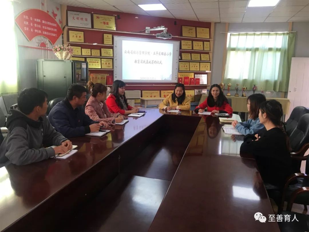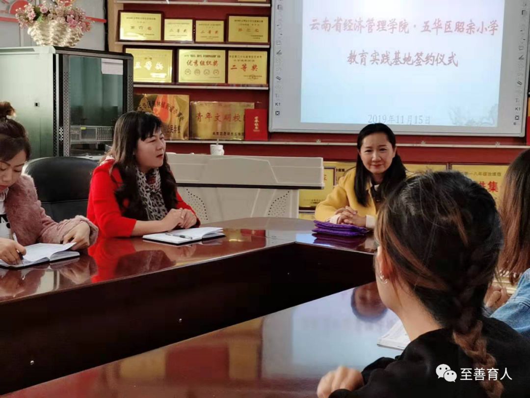 为培养应用型人才,满足社会对用人的需求,云南经济管理学院教育学院小学教育系一直努力推进校企合作。在我院校外实践基地——昆明市五华区海源小学邓国谊校长的推荐和协助下,2019年11月15日上午8:30,小学教育系副主任董勇艳和专职教师刘蓉华,到昆明市五华区昭宗小学与其洽谈校企合作事宜。参加洽谈会的有昭宗小学书记袁亚东、校长张红、工会主席唐启恩、少先队大队辅导员李江波,党支部支委张德林、数学教研组长杨国芳、专科教研组长金玉娇。洽谈会由昭宗小学校长张红主持。