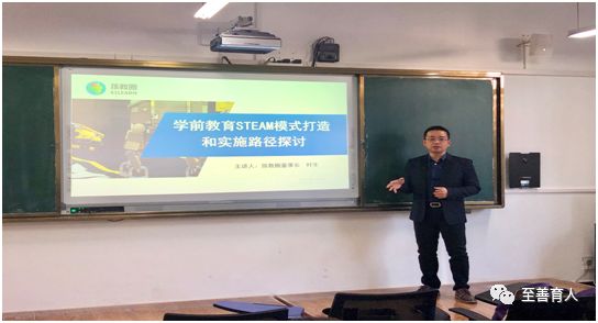 次日上午10时,广东孩创圈教育科技有限公司董事长叶生给学前教育系全体教师开展了题为“学前教育STEAM模式打造和实施路径探讨”的“STEAM创客空间”理论培训。主要介绍了“STEAM”教育的定义,即关于科学、技术、工程、艺术以及数学的以孩子为中心,培养孩子的创造力,以做中学、重实践、重创造的跨学科教育模式。接着,叶董事长还介绍了“STEAM”教育的教育理念、教学方式、三大模式、幼儿园打造STEAM的方法及路径等,使学前教育系教师对STEAM教育有了科学系统的认识。