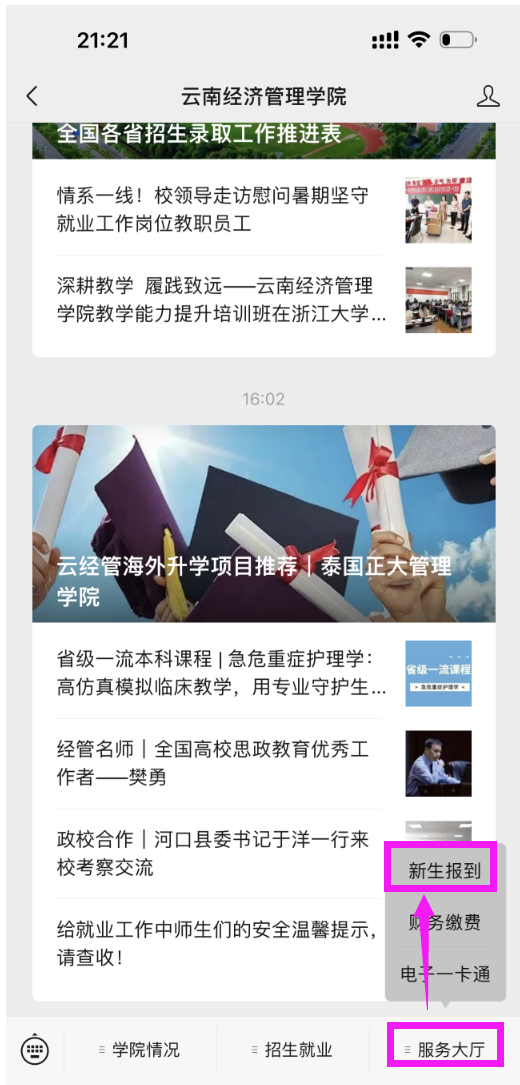 第一步:关注“云南经济管理学院”公众号,微信号:ynjgy2013